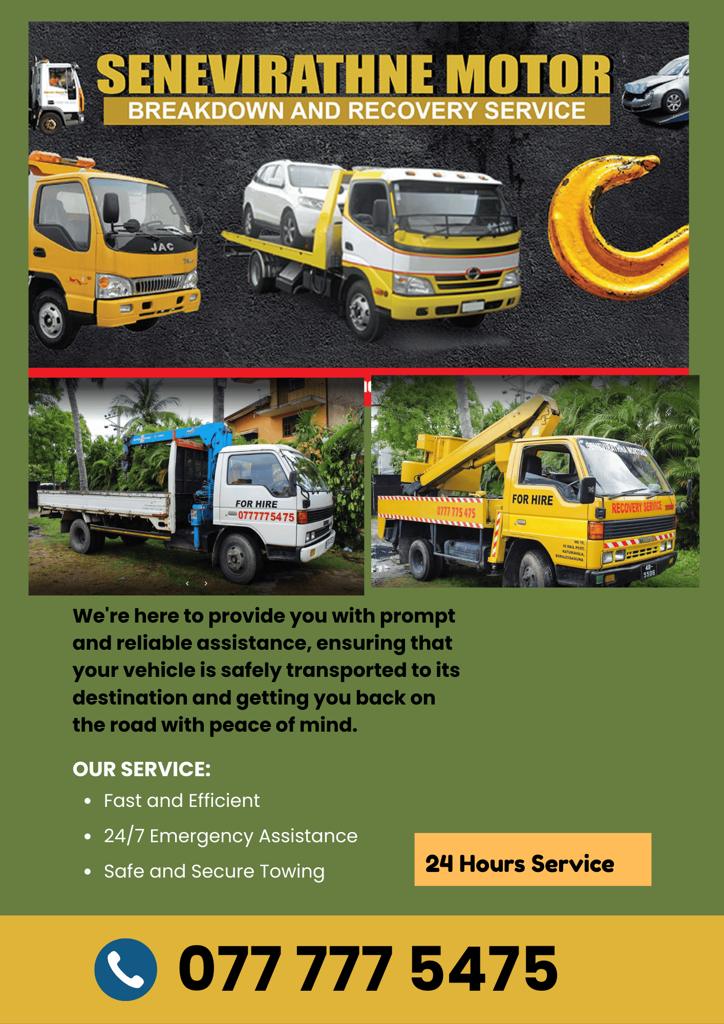 Based in Piliyandala, Senavirathne Motor Breakdown & Recovery Service provides premier, 24/7 island-wide vehicle assistance. We specialize in emergency towing, accident recovery, and roadside repairs for all vehicle types at the most competitive rates in the Colombo district.