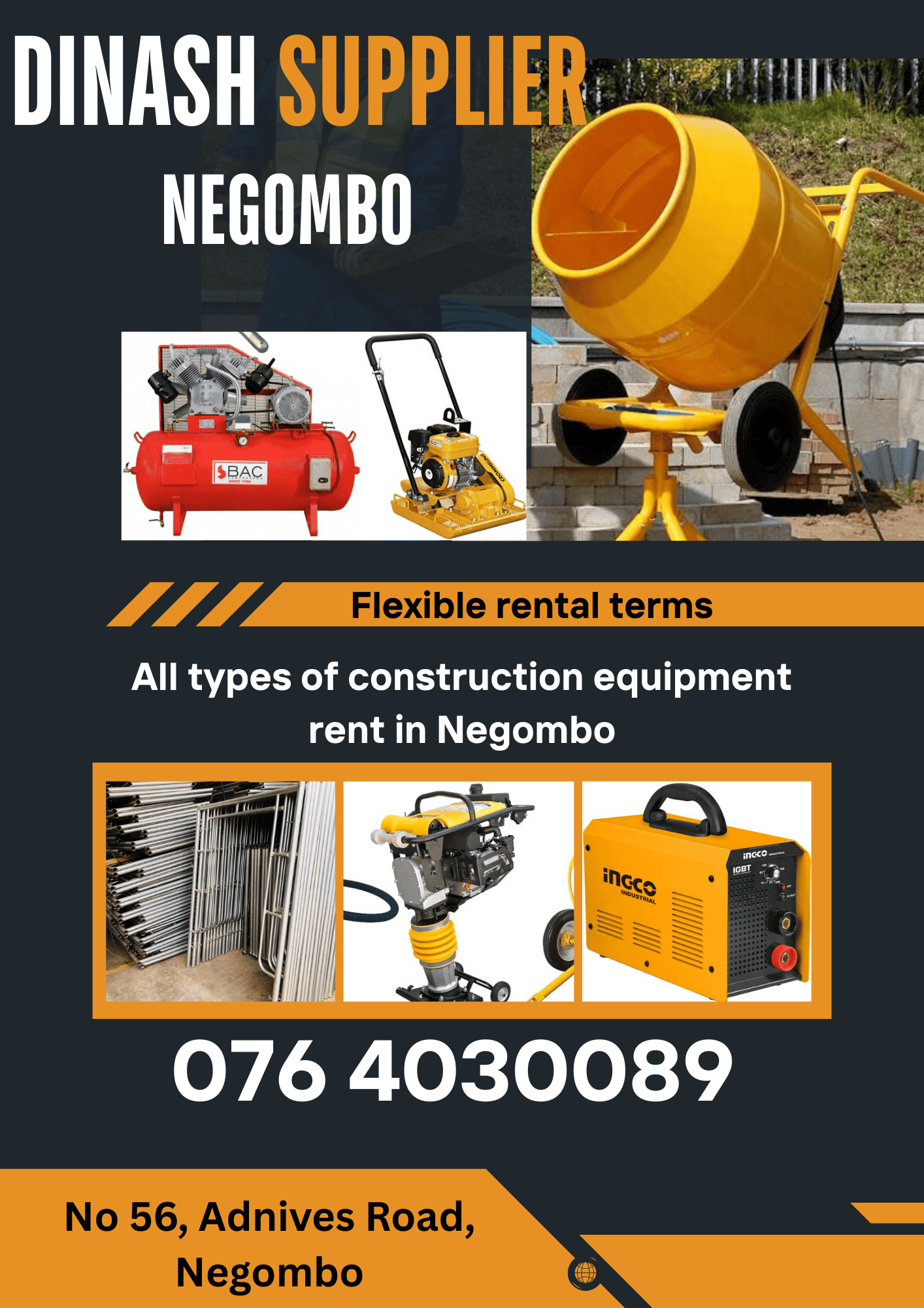 Dinash Supplier is a trusted construction equipment rental service based in Negombo, providing reliable equipment and tools for projects of all sizes.