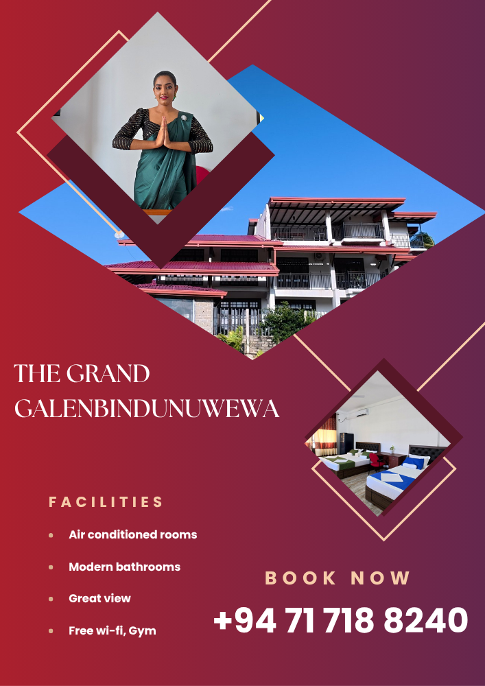 The Grand Galenbindunuwewa is the ideal base for exploring many of Sri Lanka’s top attractions. It offers easy access to the historic Anuradhapura and Mihintale sacred sites, Hurulu National Park, Ritigala, Sigiriya, Dambulla, and the beautiful beaches of Trincomalee and Nilaveli. The hotel features fully air-conditioned double, triple, and family rooms overlooking a scenic paddy field. Experience warm hospitality and exceptional comfort during your stay at The Grand Galenbindunuwewa.