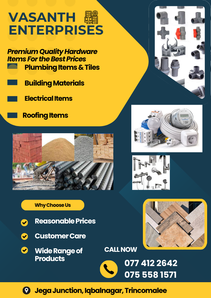 Vasanth Enterprises, a prominent hardware store in Trincomalee, is conveniently located on Nilaveli Road at Iqbalnagar. We have comprehensive inventory of hardware items, catering to a wide range of needs. Our product offerings include: