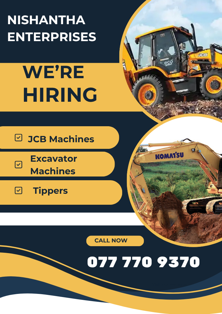 Nishantha Enterprises is a leading construction machinery hire service based in the Ja-Ela area. We provide JCB and excavator machines for hire at the most competitive rates. Our services include land preparation, demolition, land leveling, trenching, foundation works, and all related construction activities across Gampaha, Ja-Ela, Kadawatha, and Wattala.